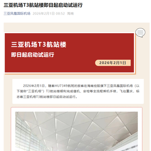 IT之家 2 月 1 日消息,今日,随着 HU7349 航班的旅客在海南控股旗下三亚凤凰国际机场(以下简称“三亚机场”)T3 航站楼顺利完成值机、安检等全流程乘机手续,飞往重庆,标志着三亚机场 T3 航站楼即日起启动试运行。