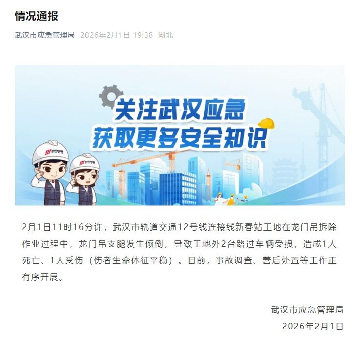 新京报讯 据武汉市应急管理局消息,2月1日11时16分许,武汉市轨道交通12号线连接线新春站工地在龙门吊拆除作业过程中,龙门吊支腿发生倾倒,导致工地外2台路过车辆受损,造成1人死亡、1人受伤(伤者生命体征平稳)。目前,事故调查、善后处置等工作正有序开展。