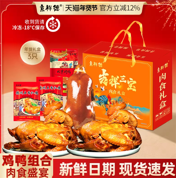 北京烤鸭1只+德州扒鸡2只28.9元:京祥德肉食礼盒发车