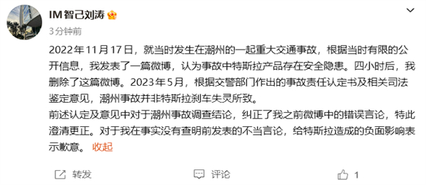 快科技2月5日消息,昨晚,智己汽车联席CEO刘涛发布微博,就自己在2022年针对特斯拉发表的言论致歉: