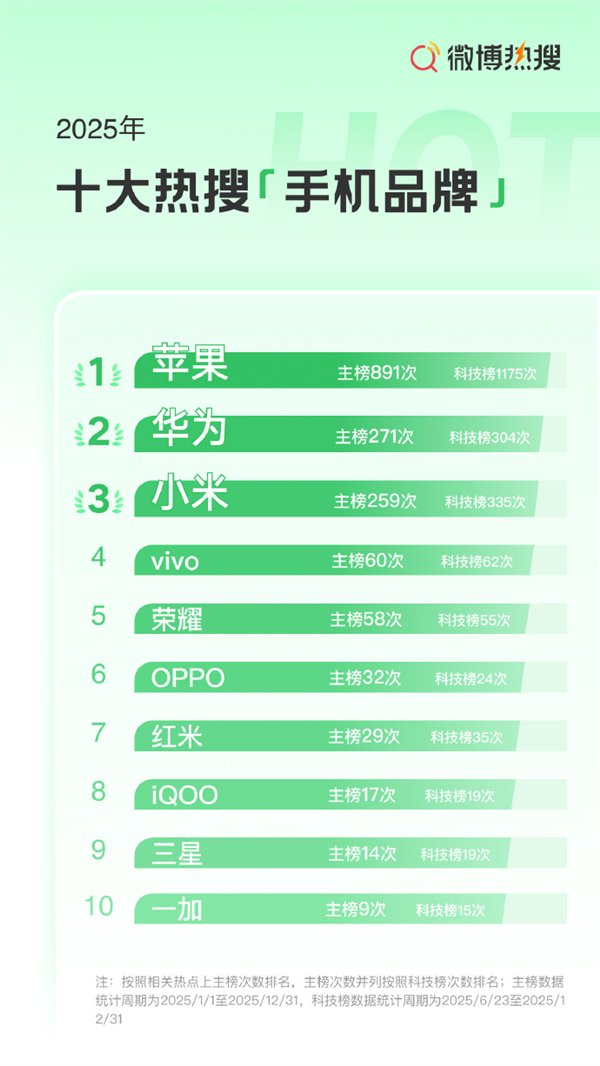 榜单显示,苹果稳居2025年十大热搜手机品牌榜首,累计上了891次热搜,次数甚至超过华为、小米、vivo、荣耀等其余九个品牌之和。