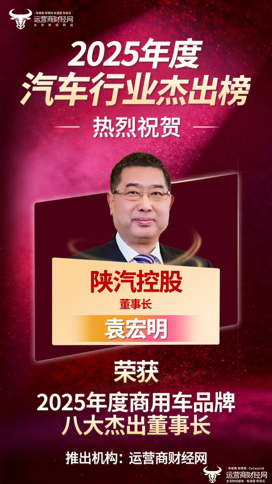 基于运营商财经网对商用车企业的综合考量,日前该媒体正式突出了“2025年度商用车品牌八大董事长”名单,陕汽控股董事长袁宏明凭借突出成绩成功入选!热烈祝贺!