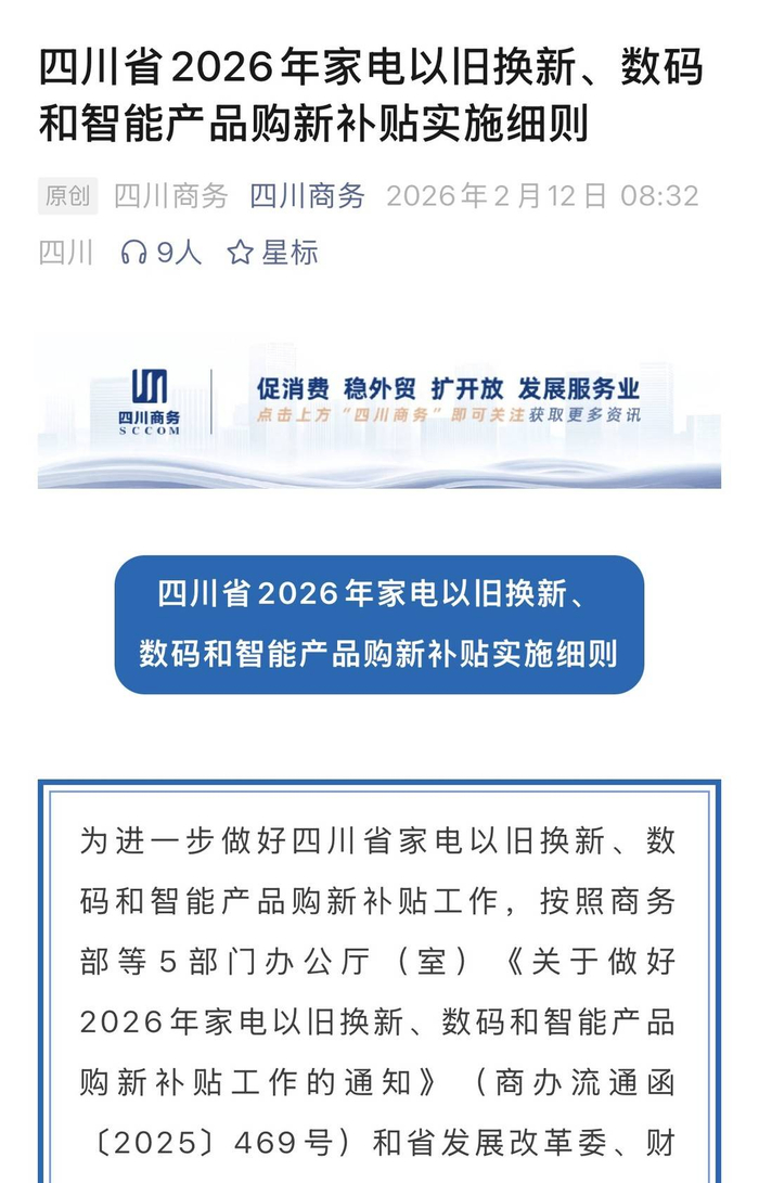2月12日,四川省商务厅发布四川省2026年家电以旧换新、数码和智能产品购新补贴实施细则。