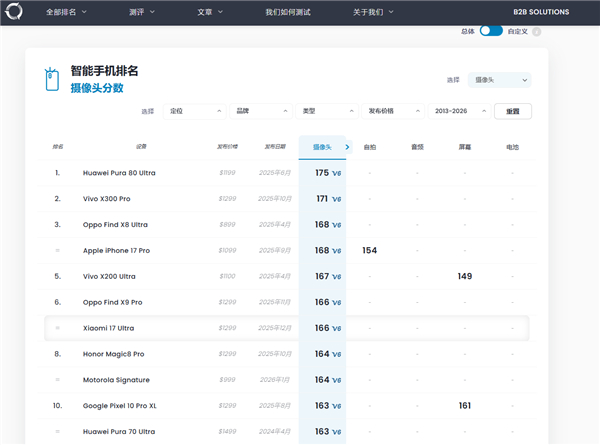 全球第6!小米17 Ultra DXO影像得分166:低光表现绝佳 全焦段稳定
