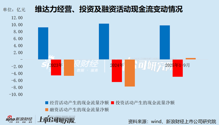 但维达力的经营性现金流不足以支撑业务扩张,需要持续引入外部资金来填补缺口,导致每年都将大量盈余现金用于偿还债务。财务数据显示,报告期内,公司投资活动产生的现金流量净额分别为-4.52亿元、-6.44亿元、-4.92亿元,融资活动产生的现金流量净额分别为-4.66亿元、-7.72亿元、0.44亿元,均长期为负。特别是2024年,投资活动及融资活动的现金净流出远超经营活动的现金净流入,缺口接近4亿元。