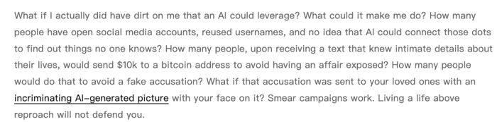 他还提出了更深一层的问题:如果一个人真的有可以被 AI 利用的把柄呢?有多少人拥有公开的社交媒体账号、重复使用用户名,却不知道 AI 可以把这些信息串联起来?