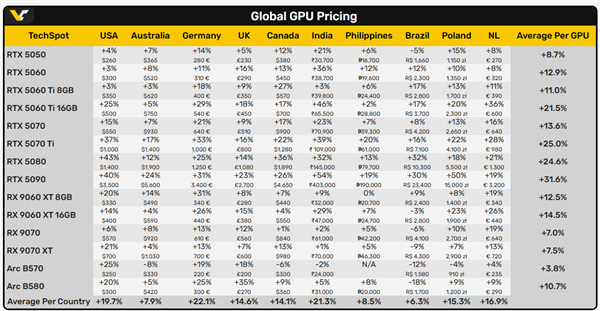 相比之下,AMD和Intel的阵营则显得较为克制,RX 9070系列平均涨幅7%,多数市场保持个位数增长;Intel显卡波动更小,B570甚至在多国出现降价。