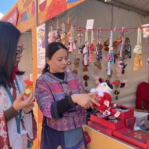 顺着市集往里走,一股药香扑面而来,这是广西非物质文化遗产麽乜(mō miē)散发出来的香味。工作人员介绍,麽乜的外观似娃娃,怀抱的龙珠里填充有香茅、艾草、菖蒲等草本植物。“麽,在我们的方言中是神明的意思,乜,是妈妈的意思。麽乜代表着双重守护的含义,在广西右江流域广泛流传,是一种吉祥物。”记者看到,摊位上除了传统外观的麽乜,还有车挂版的麽乜,此次进京,麽乜还戴上了毛茸茸的帽子,十分可爱。