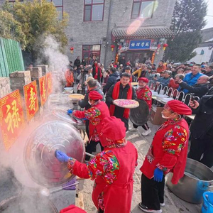 初五一早,范各庄村热闹非凡,大锅依次排开,热气蒸腾、香气弥漫,身着统一服装的工作人员与志愿者在灶前忙碌不停,锅中象征“五福临门”的五色饺子翻滚沸腾。众多市民游客慕名而来,早早排起长队。
