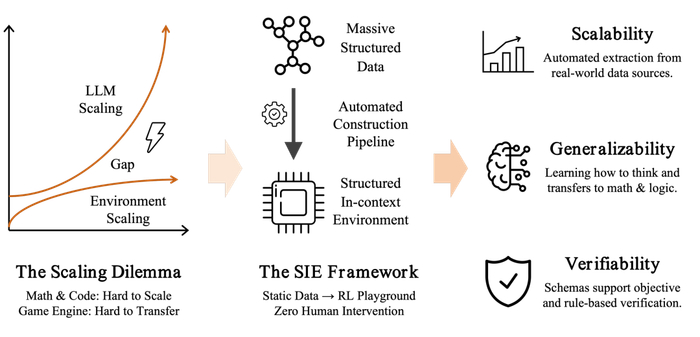 上海交通大学提出的 SIE 框架,通过挖掘结构化数据的巨大潜力,成功构建了兼具扩展性与泛化性的 RL 推理环境。该研究不仅在技术上证明了低成本自动化流水线构建环境的可行性,更在实验上证实了通过结构化探索学到的推理范式具有强大的通用性。这种让模型在缺失信息和干扰信息中探索环境的过程,有效地将外部结构化知识内化为模型自身的推理参数。SIE 框架的提出,为大模型推理能力的后训练提供了一条无需依赖昂贵人工标注的新路径,也向着利用全球海量结构化数据实现通用人工智能迈出了坚实的一步。