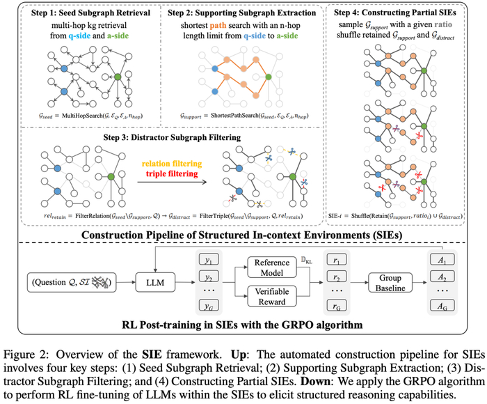 SIE 框架的核心在于如何将静态的数据转化为动态的、具有挑战性的推理环境。研究团队设计了一套精密的自动化流水线,将环境动态编码为结构化上下文,并作为软约束置入提示词中。模型的思维过程被建模为在这一上下文中的隐式动作序列,其最终输出直接用于计算环境奖励信号。为了验证这一框架,团队基于 Freebase 知识图谱构建了 RL 训练环境,其过程包含四个关键步骤。
