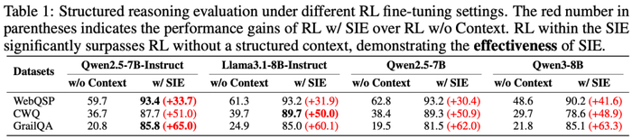 实验首先验证了 SIE 框架在领域内结构化推理任务上的表现。在 WebQSP、CWQ 和 GrailQA 等数据集上,相较于没有结构化上下文的 RL 基线,SIE 框架带来了巨大的性能飞跃。例如,在 WebQSP 任务上,引入 SIE 后模型性能平均提升了 30% 以上。这一结果表明,通过在结构化环境中进行探索式学习,模型处理复杂关联信息和多跳组合推理的能力得到了有效的提升。