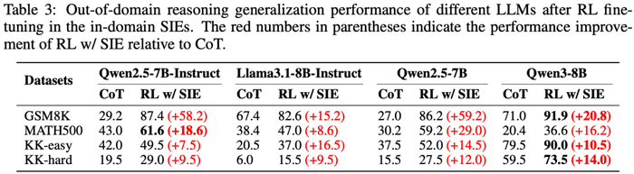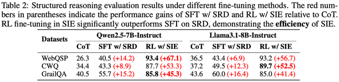 这部分是该研究最核心的发现之一。在基于知识图谱构建的结构化环境中训练出的模型,其推理能力能成功迁移到数学和逻辑等领域外任务。在 GSM8K/MATH500(数学推理)以及 Knights & Knaves(逻辑谜题)测试中,经过 SIE 训练的模型均表现出优异的泛化性能。例如,经过结构化 RL 训练,Qwen2.5-7B-Instruct 在 GSM8K 上的准确率从 29.2% 提升至 87.4%。这有力地证明了 SIE 框架培养的是一种通用的、底层的组合推理技能,而非特定领域的过拟合能力,打破了以往认为结构化推理无法迁移到通用推理的印象。