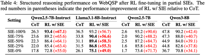 最后是部分可观测性(Partial Observability)的引入。为了进一步激发模型的推理潜能,迫使模型进行深度推理而非简单的记忆匹配,研究团队构建了一系列信息密度递减的部分 SIE(Partial SIEs)。通过人为控制支撑子图的保留比例(如 100%、75%、50%、25% 甚至 0%),模型被置于信息缺失的困境中。在 RL 微调阶段,团队使用了 GRPO 算法,并引入了答案奖励与格式奖励的双重机制,模型必须学会在信息不足时利用干扰项作为负向约束,并调动内部知识进行验证与推理,从而真正掌握结构化的多跳组合推理。
