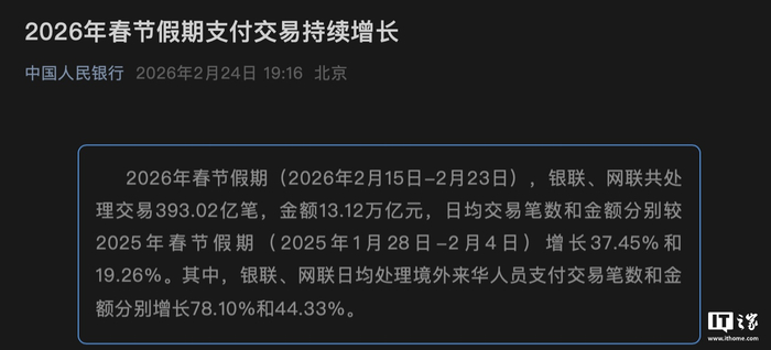IT之家在此援引官方公众号报道,今年春节假期期间的日均交易笔数和金额分别较 2025 年春节假期(2025 年 1 月 28 日-2 月 4 日)增长 37.45% 和 19.26%。其中银联、网联日均处理境外来华人员支付交易笔数和金额分别增长 78.10% 和 44.33%。