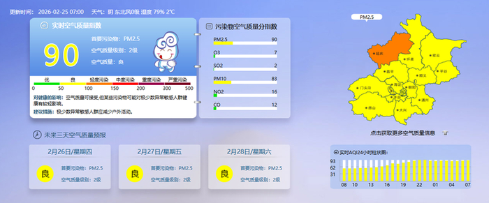 据北京市生态环境监测中心今早7时数据,目前实时空气质量指数90,空气质量良。