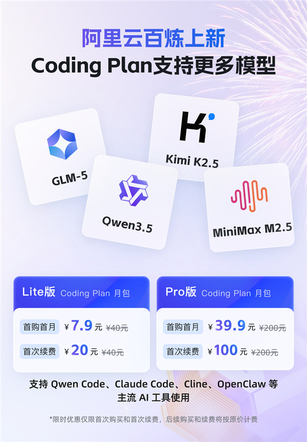 用户订阅后,可在Qwen Code、Claude Code、Cline、OpenClaw等AI工具上无缝切换使用这些模型。