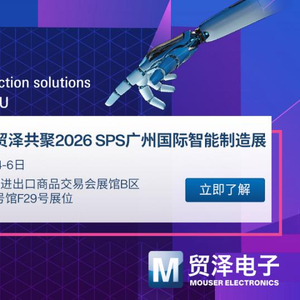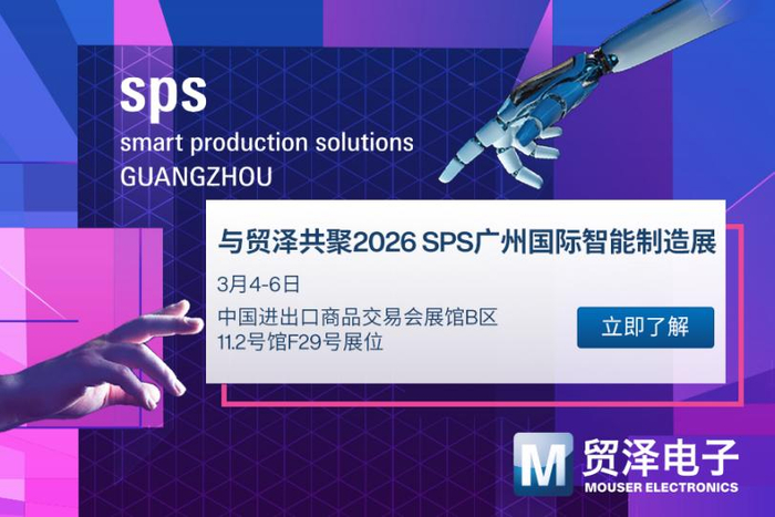 专注于引入新品的全球电子元器件和工业自动化产品授权代理商贸泽电子 (Mouser Electronics)宣布,将于3月4-6日亮相2026 SPS广州国际智能制造展(展位号:11.2号馆F29号)。本届展会,贸泽电子将携手安费诺、恩智浦、 芯科科技、VICOR等国际知名厂商,聚焦AI+制造,带来面向工业自动化、机器人技术与工业5.0的领先解决方案。