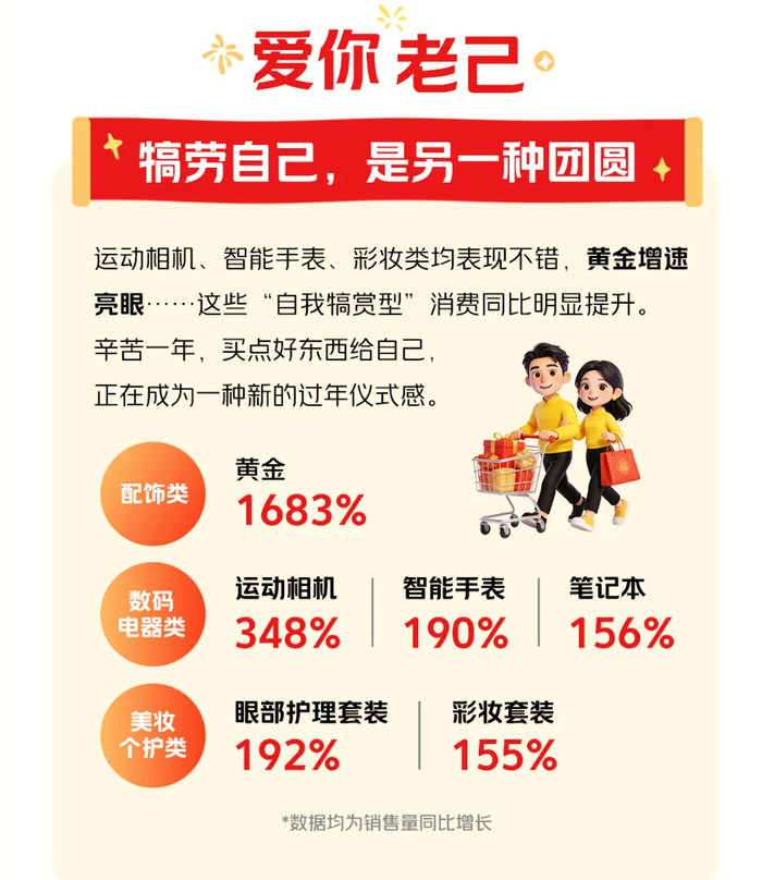 而在悦己消费趋势下,自我犒赏型消费成为新的过年仪式感。黄金配饰类销量同比暴涨1683%,智能手表、运动相机等数码电器类产品分别实现348%、156%的同比增长,彩妆套装、眼部护理套装等美妆个护类产品也有超100%的同比增长。