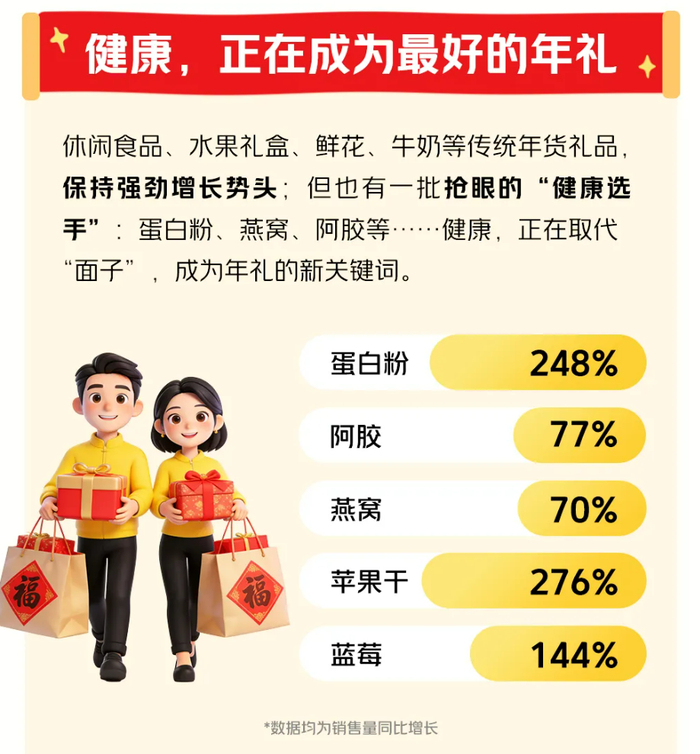 礼赠消费的内核也在发生转变,健康取代“面子”成为年礼的新关键词。休闲食品、水果礼盒等传统年货礼品保持强劲增长,蛋白粉、燕窝、阿胶等健康类礼品则表现抢眼,销量分别同比增长248%、276%、77%,苹果干、蓝莓等健康零食也迎来144%以上的同比增长,人们在年节礼赠中,更注重为家人送上健康与实用。