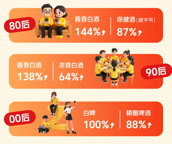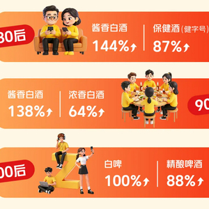 春节的欢聚场景中,消费的代际差异愈发明显,酒桌与餐桌的消费变化尤为突出。酒品选择上,80后、90后坚守传统,对酱香、浓香白酒的偏好度显著,其中80后酱香白酒销量同比增长144%,保健酒同比增长87%;90后酱香白酒销量同比增长138%,浓香白酒同比增长64%;而00后则成为新潮酒饮的消费主力,白啤、精酿啤酒销量分别同比增长100%、88%,微醺与新派成为年轻一代的春节社交语言。