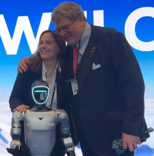 而一众代表团的德企高管在宇树科技玩嗨了!这些高管们和人形机器人牵手共舞。机器人迈着小碎步配合舞步,画面可爱又温馨,引得众人哈哈大笑。