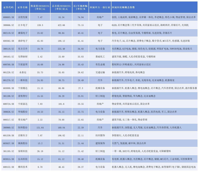 从2026年以来表现看,京投发展(600683.SH)、江丰电子(300666.SZ)、康强电子(002119.SZ)、甬矽电子(688362.SH)、东方日升(300118.SZ)、宁波精达(603088.SH)、喜悦智行(301198.SZ)等20家公司涨幅超过20%。