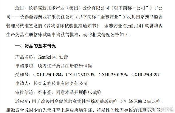 今日,针对网传“在研产品GenSci141软膏可以壮阳”的传言,长春高新公司人士回应称,一切信息应以公告披露内容为准,该产品当前仅获批开展此前公告所述临床试验,适应症需严格按照批件执行。