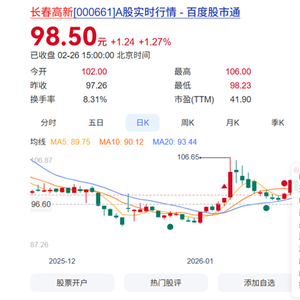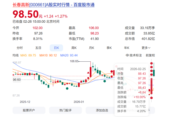 2月25日,长春高新以报收97.26元/股,迎来2026年开年以来首个涨停。