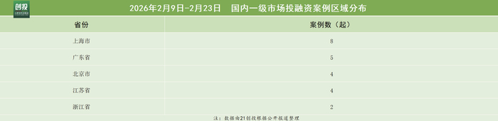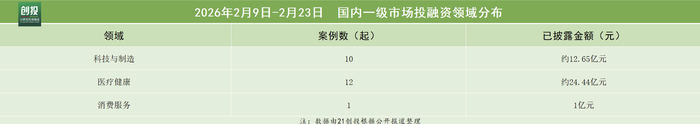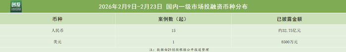 21创投不完全统计,2026年2月9日—2月23日,国内一级市场共披露融资事件23起,覆盖科技与制造、医疗健康、消费服务三大领域。其中有16笔融资披露了融资金额和币种信息,披露融资总规模超38.09亿元人民币,大额融资集中在先进制造、生物医药等赛道。