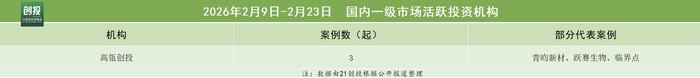 从机构投资活跃度来看,过去两周高瓴创投较为活跃,完成3笔融资,主要聚集医疗健康领域。