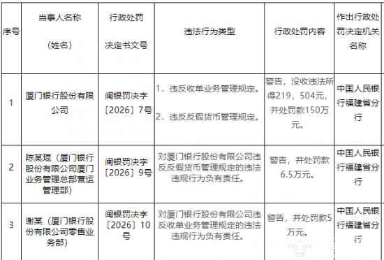 具体来看,厦门银行因违反收单业务管理规定,违反反假货币管理规定,被中国人民银行福建省分行警告,没收违法所得219504元,并处罚款150万元。