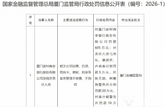 具体来看,厦门农商行此次因相关公司治理、信贷、信用卡、理财、同业等业务管理不审慎、不到位,被罚款605万元。