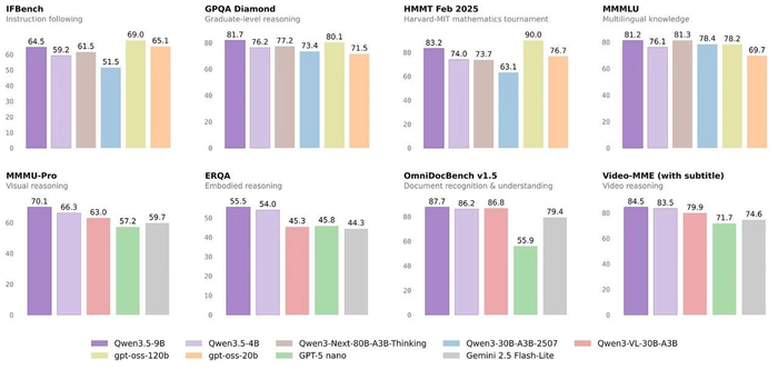 至此,千问 3.5 家族已开源 Qwen3.5-397B-A17B 的大尺寸模型,Qwen3.5-122-A10B、Qwen3.5-35B-A3B、Qwen3.5-27B 等 3 个中型尺寸模型,以及此次开源的 Qwen3.5-9B/4B/2B/0.8B 的 4 款小尺寸模型。