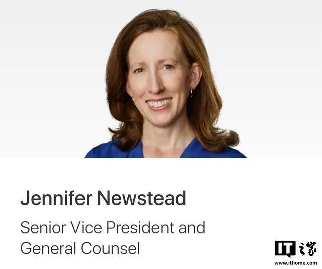 前 Meta 首席法务官 Jennifer Newstead 于 2026 年 3 月 1 日正式加盟苹果,出任高级副总裁兼总法律顾问。