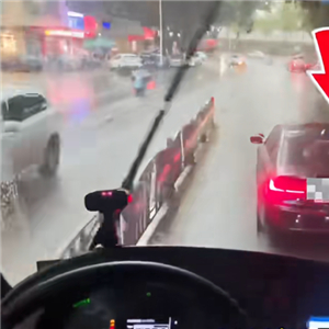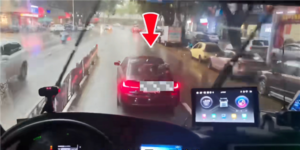 然而私家车不仅没有加速驶离或者靠边让行。反而以极其缓慢的速度在空旷的路面上行驶。