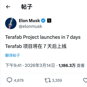 IT之家 3 月 14 日消息,今天晚间,马斯克通过 X 平台宣布:特斯拉自建 TeraFab 晶圆厂项目将在 7 天后上线。