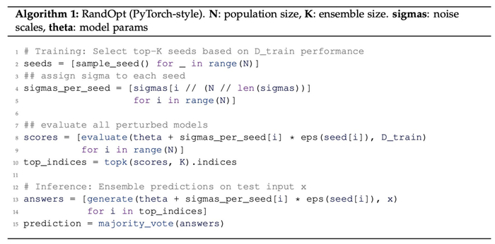 训练(随机猜测与检查):算法从标准高斯分布中采样出 N 个随机种子和对应的噪声尺度,将其直接加到基础模型的权重上,生成 N 个扰动后的模型副本。随后,让这些模型在一个小的训练集(或验证集)上运行,并根据得分选出表现最好的 Top-K 个模型。
