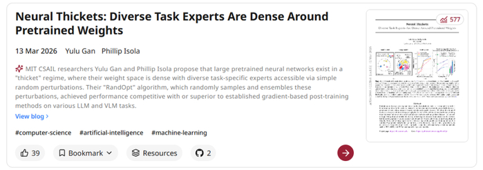 论文标题:Neural Thickets: Diverse Task Experts Are Dense Around Pretrained Weights