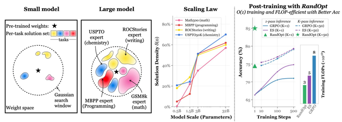 论文指出,预训练模型不仅仅是后训练的「起点」,其权重空间内已潜藏着大量任务专家。随着模型规模的增大,这些专家在权重空间中的分布密度急剧增加,足以让随机扰动和集成方法有效捕捉优越的解决方案。