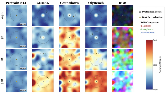 为了直观展示神经丛林的存在,研究团队对参数量从 0.5B 到 32B 的 Qwen2.5 预训练模型注入了 1000 个随机权重扰动,并通过随机投影技术将其准确率景观可视化到了二维平面上。