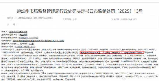 此前,在2025年6月,楚雄州市场监督管理局发布的行政处罚决定书中,台铃就曾被点名过。当时,该品牌型号为TDTD067Z的电动自行车,整车质量、尺寸限值(鞍座长度)、蓄电池防篡改等项目均不合格。