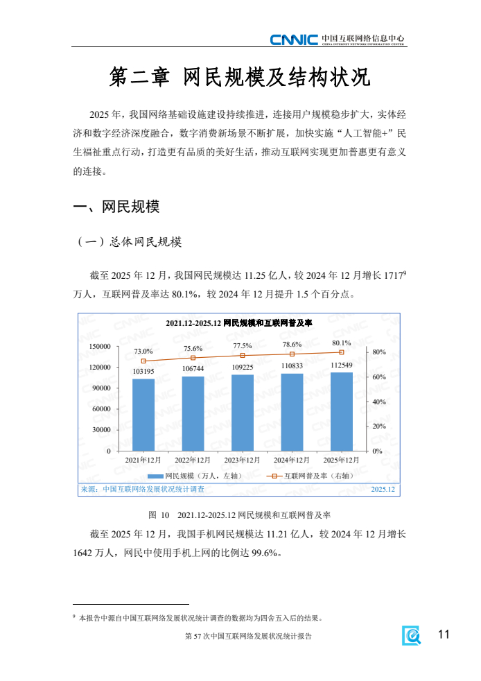 截至2025年12月,我国网民规模达11.25亿人,较2024年12月增长1717万人,互联网普及率达80.1%,较2024年12月提升1.5个百分点。