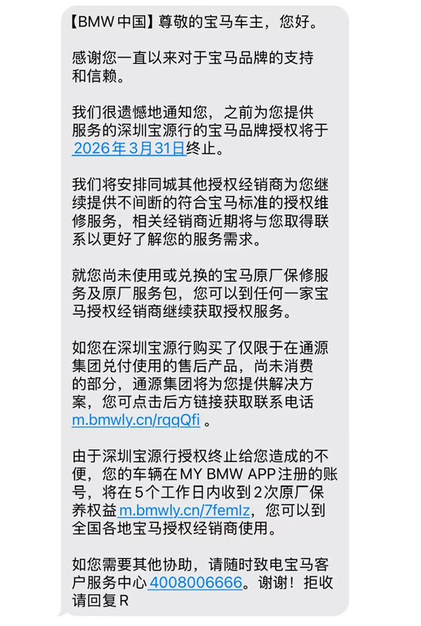通知称:宝源行的宝马品牌授权将于2026年3月31日终止。