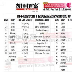 胡润表示,本次榜单共收录20个国家150位白手起家,身价超过十亿美金的女性企业家,中国以78位上榜者领跑全球,占比超五成。