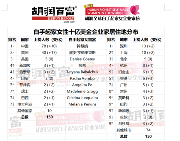 2026胡润全球白手起家女企榜发布:深圳13人上榜居全球第一
