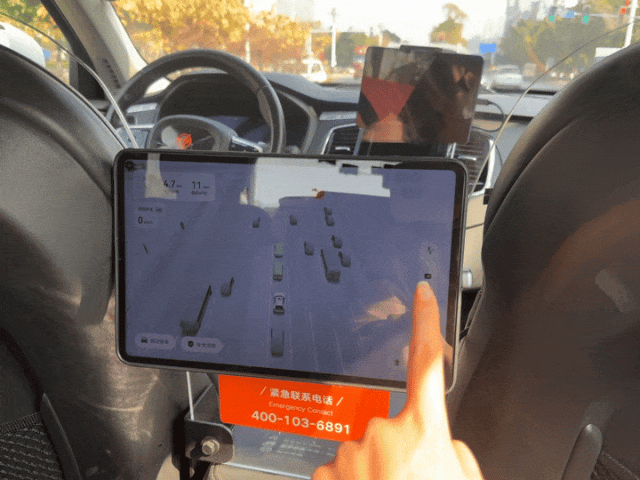 车内前排的两个座椅之间,面向后排有一块屏幕,除了在上面输入乘客手机尾号开启行程、做一些提醒之外,行程中屏幕会实时显示车辆系统感知到的视野,可以识别车辆周围的车、人、非机动车,以及信号灯。