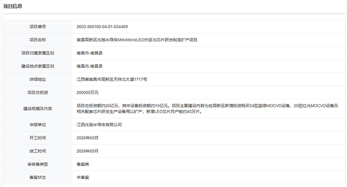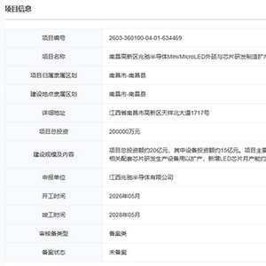 3月16日,江西省投资项目在线审批监管平台正式公布“南昌高新区兆驰半导体Mini/Micro LED外延与芯片研发制造扩产项目”,项目编号为2603-360100-04-01-634469。