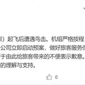 此前,据媒体报道,有网友发布消息称,当天下午由上海虹桥机场飞往深圳宝安机场的南航CZ3554次航班疑似遭遇撞鸟事件返航。