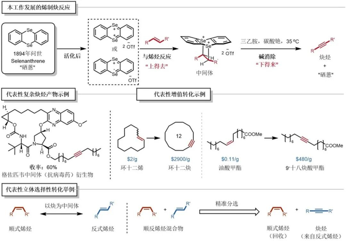 研究人员发现,硒蒽这种含硒杂环分子最早于 19 世纪末被合成,但在其后 130 余年间极少被用于合成反应。通过级联活化策略,硒蒽能够在温和条件下先与烯烃发生加成反应,再在弱碱环境下顺利离去,从而将烯烃的碳碳双键重塑为三键结构。该试剂制备步骤简单,性质稳定,可回收使用,且反应条件温和,能够兼容多种敏感官能团,适用于复杂分子的后期修饰。